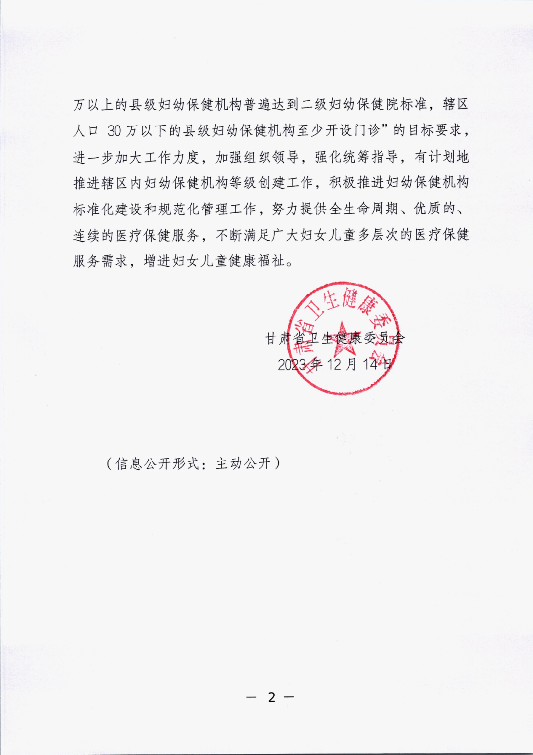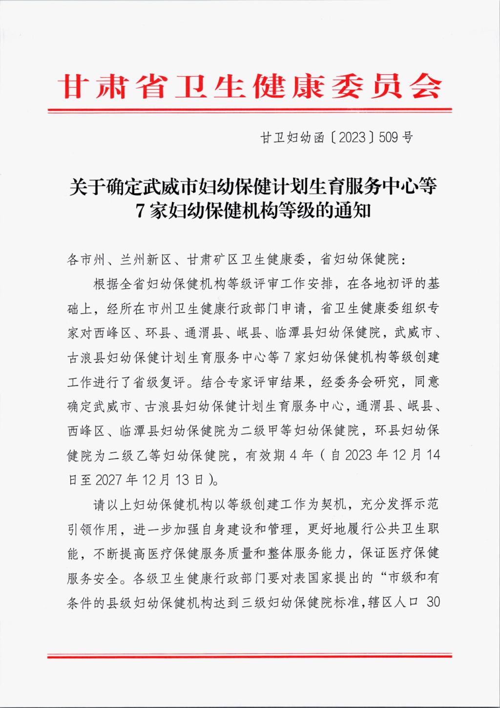 12月14日,根据省卫生健康委《关于确定武威市妇幼保健计划生育服务中心等7家妇幼保健机构等级的通知》(甘卫妇幼函〔2023〕509号)文件,同意临潭县妇幼保健院为二级甲等妇幼保健院。