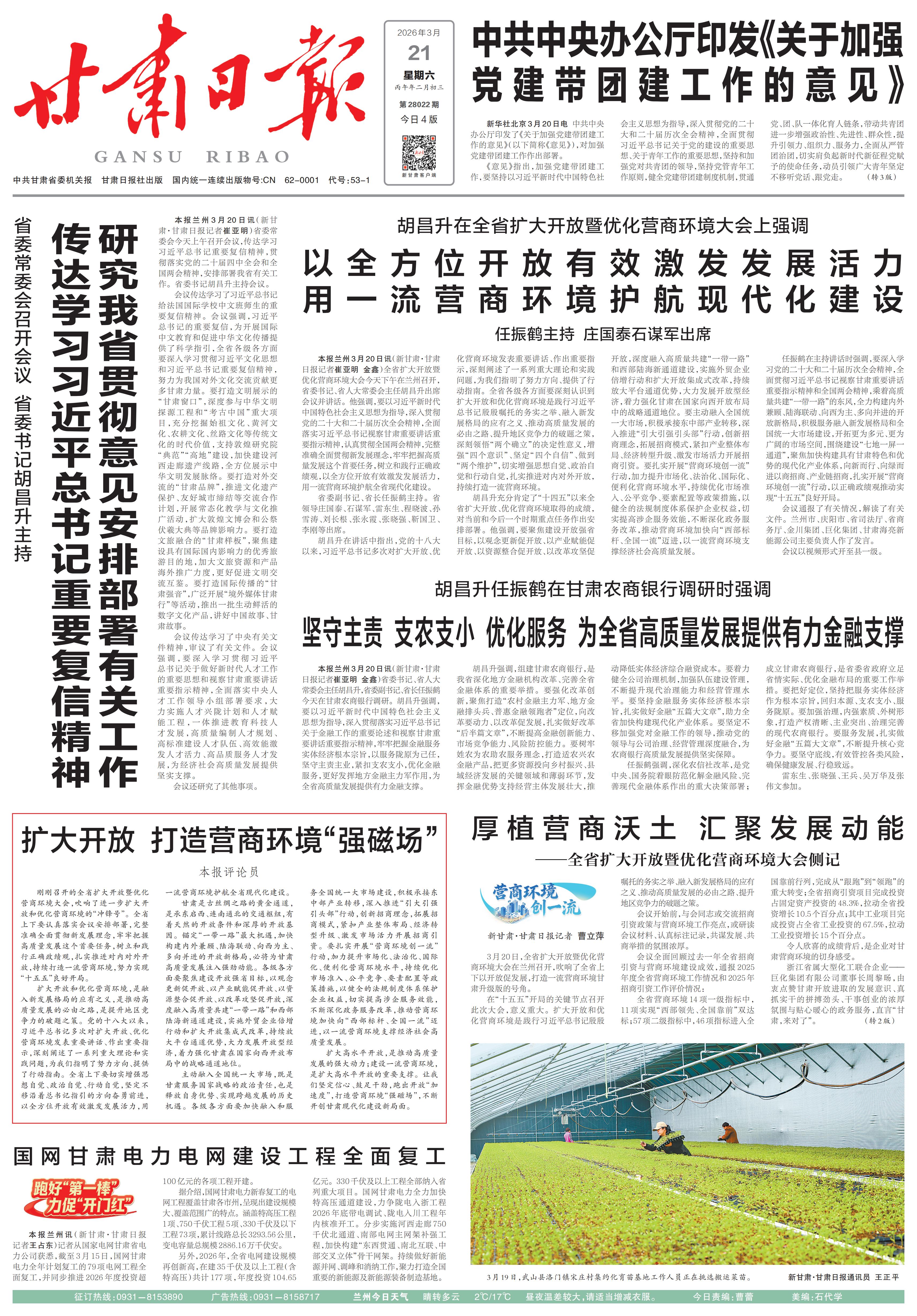 新甘肃·甘肃日报记者 曹立萍 3月20日,全省扩大开放暨优化营商环境大会在兰州召开,吹响了全省上下以开放促发展,打造一流营商环境甘肃升级版的号角。 在“十五五”开局的关键节点召开此次大会,意义重大。扩大开放和优化营商环境是践行习近平总书记殷殷嘱托的务实之举、融入新发展格局的应有之义、推动高质量发展的必由之路、提升地区竞争力的破题之策。 会议开始前,与会同志或交流招商引资政策与营商环境工作亮点,或研读会议材料、认真标注记录,共谋发展、共商举措的氛围浓厚。 会议全面回顾过去一年全省招商引资与营商环境建设成效,通报2025年度全省营商环境工作情况和2025年招商引资工作评价情况: 全省营商环境14项一级指标中,11项实现“西部领先、全国靠前”双达标;57项二级指标中,46项指标进入全国靠前行列,完成从“跟跑”到“领跑”的重大转变;全省招商引资项目完成投资占固定资产投资的48.3%,拉动全省投资增长10.5个百分点;其中工业项目完成投资占全省工业投资的67.5%,拉动工业投资增长15个百分点。 令人欣喜的成绩背后,是企业对甘肃营商环境的切身感受。 浙江省属大型化工联合企业——巨化集团有限公司董事长周黎旸,由衷点赞甘肃开放进取的发展意识、真抓实干的拼搏劲头、干事创业的浓厚氛围与贴心暖心的政务服务,直言“甘肃,来对了”。 “甘肃,不仅是海亮集团新能源材料产业的战略核心区,更是我们企业实现跨越式发展的福地。”甘肃海亮新能源材料有限公司董事长王树光深有感触地说,企业自2021年底落户兰州新区以来,总投资89亿元的高性能铜箔材料项目,经过4年多的精耕细作,已成长为全球最大的锂电铜箔单体生产基地之一。 大会现场,甘肃省营商环境建设局还全面解读《甘肃省2026年营商环境创一流行动方案》及《2026年全省营商环境创一流行动工作要点》,对2026年全年营商环境建设重点任务作出全面安排。 蓝图已经绘就,实干创造未来。 庆阳市委书记周继军表示,庆阳市将招商引资作为“头号工程”,深入开展“引大引强引头部”行动,招商引资综合评价连续两年全省第一,省外到位资金连续三年实现百亿级增长。下一步将认真落实此次会议精神,深入推进国家向西开放战略通道行动,加快打造陕甘宁区域重要向西开放节点城市,在承接东中部产业转移、连接西部口岸、辐射中西亚市场中发挥重要作用。 省商务厅厅长杨小平介绍,近年来,甘肃紧抓“一带一路”最大机遇,坚持外资、外贸、外经、外运“四外联动”,开放型经济稳中有进、质效双升。今年,全省商务系统将以高水平对外开放集成式改革为牵引,持续强招商、稳外贸、优平台、畅通道,为建设开放强省贡献商务力量。 省司法厅厅长谢又生表示,全省司法行政系统将按照此次会议要求,持续以立法、执法、司法、守法普法、涉外法治综合施策,打出“护企、安商、便民、增效”法治组合拳,把“法治是最好的营商环境”落到实处,为“十五五”高质量发展筑牢法治保障。 中国农业银行甘肃省分行行长吴岗表示,将深化银政企合作,以数字金融赋能服务升级,全面优化信贷审批流程;大力推广“微捷贷”“快捷贷”“链捷贷”等线上普惠产品,做精做优“陇原(金城)惠商贷”特色金融服务,精准对接小微企业、个体工商户融资需求,着力降低融资门槛、提升金融服务覆盖面与可得性,以暖心金融服务厚植经营主体发展“沃土”,为全省打造一流营商环境注入源源不断的金融“活水”。 会场内外,思想交融、共识凝聚。 与会同志一致认为,甘肃发展等不起、慢不得,必须保持不进则退、慢进也是退的紧迫感,以更大勇气和决心深化改革、扩大开放,优化营商环境,一着不让抢抓机遇,一刻不停加快发展,一步不落追赶进位,努力推动经济实现质的有效提升和量的合理增长。 来源:新甘肃 |