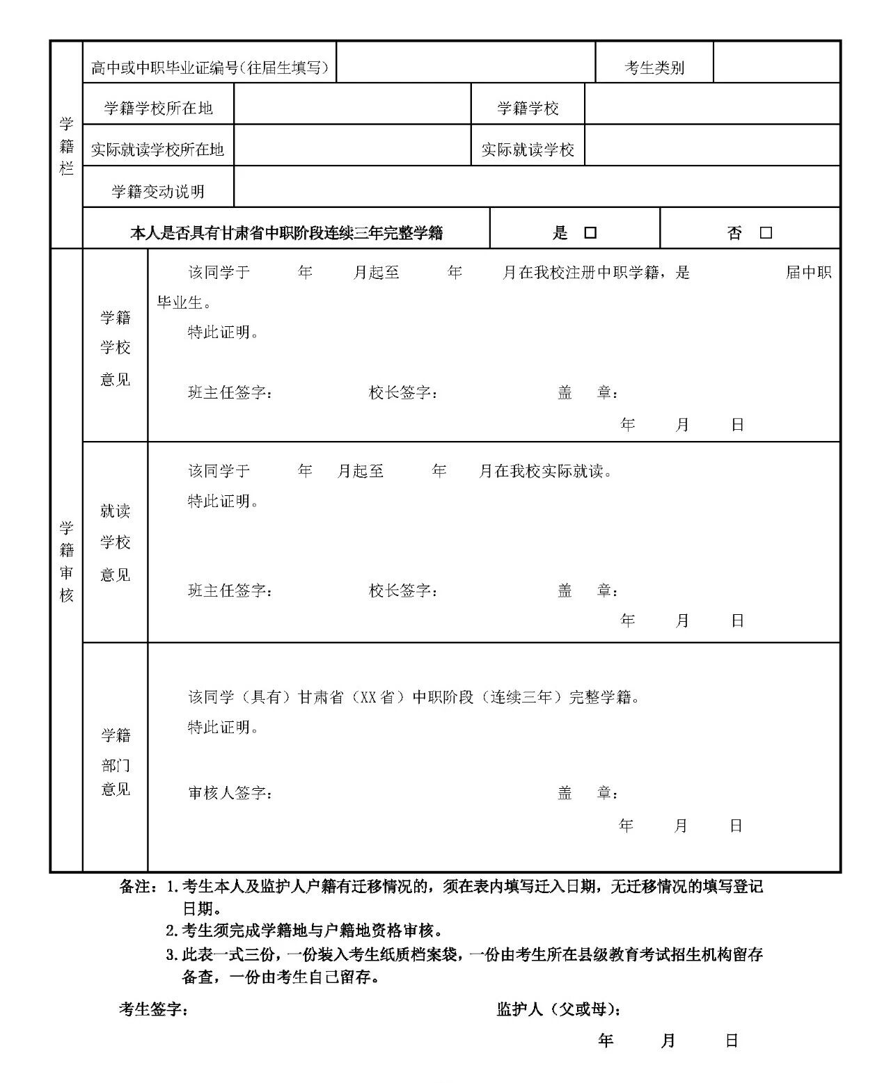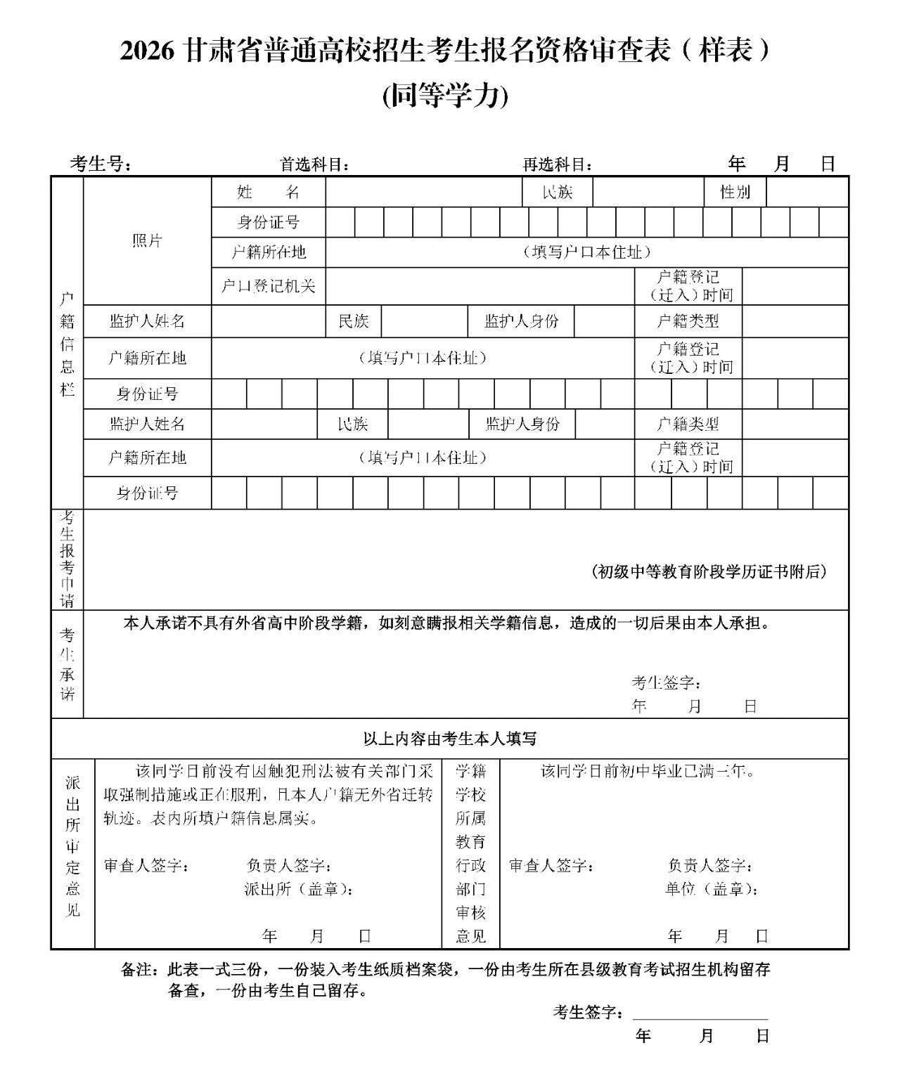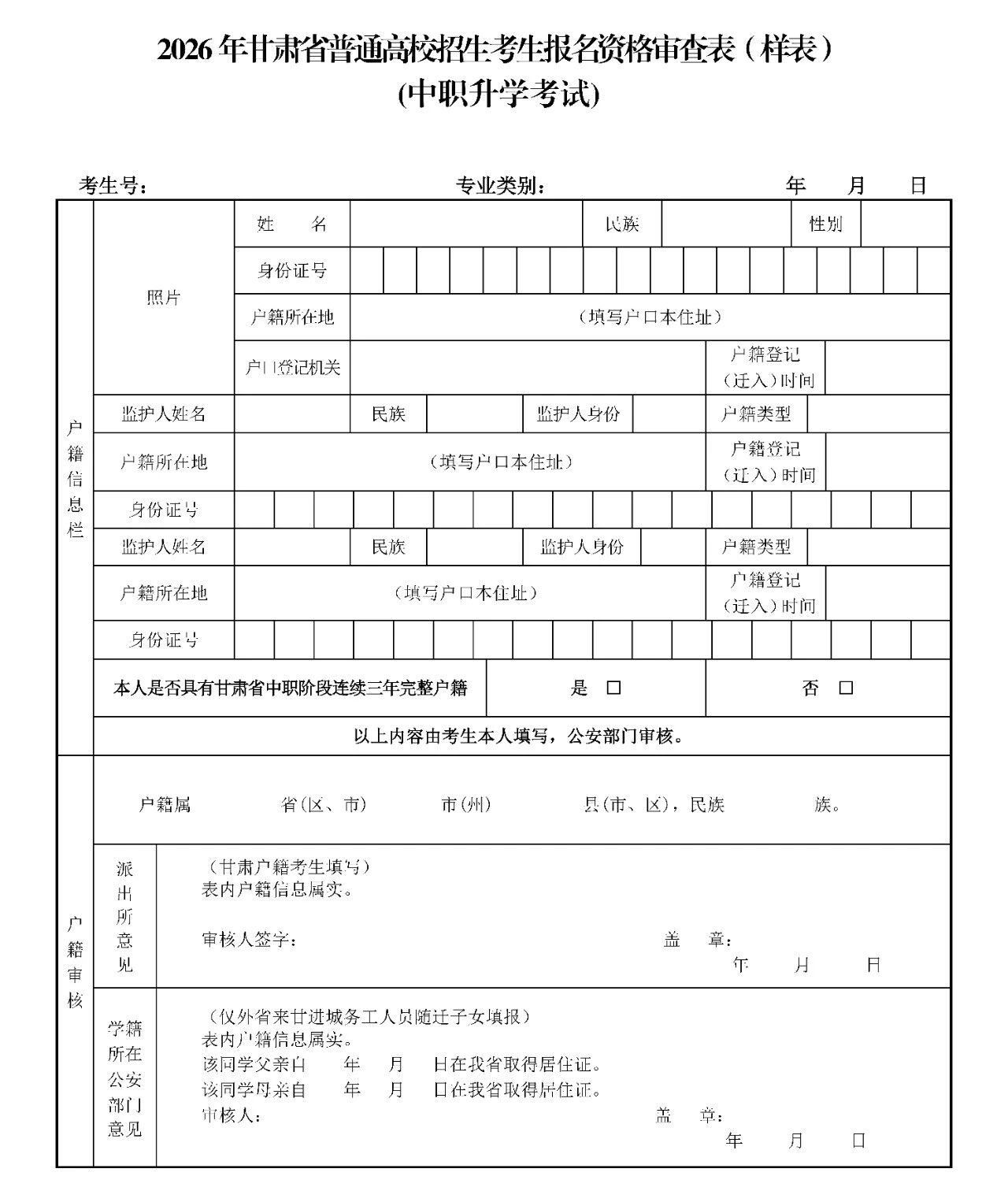 关于做好2026年甘肃省普通高校招生统一考试报名工作的通知 为稳妥做好甘肃省2026年普通高等学校招生统一考试(以下简称“普通高考”)报名工作,根据教育部及我省有关规定,现将我省2026年普通高考报名工作有关事宜通知如下: 一、报名对象 2026年参加甘肃省普通高校招生的所有考生(包括统考考生、强基计划、高水平运动队、运动训练、武术与民族传统体育专业单独招生、职教师资单独招生、残障生单独招生、保送生、拔尖人才班、消防单招及高等职业教育考试招生综合评价录取和中职升学考试等)均须在规定时间内参加报名并采集相关信息。 二、报名条件 (一)符合下列条件的人员,可以申请报名参加普通高考 1.遵守中华人民共和国宪法和法律; 2.高级中等教育学校毕业或具有同等学力; 3.身体状况符合相关要求; 4.户籍或学籍符合下列条件之一: (1)具有甘肃省户籍、高中阶段学籍的考生,出生后首次申报户口登记在甘肃(身份证号码前两位为62),无外省迁转记录,可在我省报名参加普通高考。 (2)按照教育部《2025年普通高等学校招生工作规定》“进城务工人员及其他非户籍就业人员的随迁子女接受高中阶段教育后在当地参加高考”要求,具有甘肃省户籍,出生后首次申报户口登记在甘肃(身份证号码前两位为62),无外省迁转记录,且父亲或母亲或法定监护人为我省常住户籍,在外省接受高中阶段教育的考生,在接受高中阶段教育省份报名。不符合接受高中阶段教育省份高考报名条件,不能在当地高考报名的考生,须具有外省学籍所在地教育考试招生机构出具的不能参加当地普通高考的证明或相关函件(样见附件5),并持相关人员户籍、学籍所在地教育行政部门出具的学籍、学业水平合格考考试成绩证明及综合评价信息等材料,申请在户籍所在县(市、区)报名参加普通高考。考生及父亲或母亲或法定监护人须对不能参加接受高中阶段教育省份普通高考的证明或相关函件的真实性负责,考生前往户籍所在县(市、区)教育考试招生机构进行资格审核时,签订《在甘外省份接受高中阶段教育考生参加甘肃省普通高考报名诚信承诺书》(见附件6)。 (3)外省户籍迁入我省的考生,满足下列条件之一的,可在我省报名参加普通高考。 ①考生本人在我省初中毕业、具有高中阶段连续三年完整学籍并在学籍学校实际就读的,高考报名时本人须具有我省户籍、其父亲或母亲或法定监护人具有我省户籍。 ②考生本人具有我省高中阶段连续三年完整学籍并在学籍学校实际就读的,户籍迁入我省时间须满三年(时间截止到2026年8月31日),其父亲或母亲或法定监护人具有我省户籍且满三年(时间截止到2026年8月31日)。 (4)进城务工人员随迁子女在我省参加普通高考按照《关于做好进城务工人员随迁子女接受义务教育后在我省参加升学考试工作的实施方案》(甘教厅〔2012〕216号)执行。进城(乡镇,下同)务工人员须在报考地具有合法稳定职业、合法稳定住所(含租赁)并按照国家规定参加社会保险等。 ①考生本人在我省小学毕业、具有初中连续三年完整学籍、高中阶段连续三年完整学籍并在学籍学校实际就读的,高考报名前,其父亲或母亲须在报考地具有我省合法的居住证,并在报考地缴纳养老保险或医疗保险。 ②考生本人在我省初中毕业、具有高中阶段连续三年完整学籍并在学籍学校实际就读的。其父亲或母亲须在报考地具有我省合法的居住证且居住时间满三年(时间截止到2026年8月31日),并在报考地缴纳养老保险或医疗保险满三年。 ③考生本人具有我省高中连续三年完整学籍并在学籍学校实际就读的,其父母双方须在报考地具有我省合法的居住证,且居住时间满三年(时间截止到2026年8月31日),并在报考地缴纳养老保险或医疗保险满三年。 满足上述条件之一的随迁子女考生可在学籍所在地参加高考报名,往届高中毕业随迁子女,能够继续提供父亲或母亲居住证与缴纳保险材料,上一年度在我省参加普通高考的,可继续在我省参加高考报名。不符合相关条件的考生回户籍所在省报名参加考试。 (5)在考生高中就读阶段,考生父亲或母亲军转安置或工作调动(国家机关、事业单位、驻甘部队现役军人(含文职人员)、国有企业人事管理部门办理的调动)至我省,考生同时迁转常住户籍与高中阶段学籍至我省,并在学籍学校实际就读的,出具相关证明后,可不受户籍、学籍年限限制。我省当年高考报名结束后,不再受理此类考生的报名申请。 (6)考生作为被收养人,户籍已迁入收养人名下,考生持有民政部门出具的有效证明,收养人具有我省户籍且满三年(时间截止到2026年8月31日),考生本人具有我省高中阶段连续三年完整学籍并在学籍学校实际就读。 (7)中职生报名 ①具有甘肃省户籍,出生后首次申报户口登记在甘肃(身份证号码前两位为62),无外省迁转记录,具有我省中等职业学校(含中师、职业中专(职业高中)、成人中专、技工学校,下同)学籍的应往届毕业生可报名参加中职升学考试,也可报名参加普通高考。 ②具有甘肃省户籍,出生后首次申报户口登记在甘肃(身份证号码前两位为62),无外省迁转记录,且父亲或母亲或法定监护人为我省常住户籍的非我省中等职业学校学籍的中职毕业生,不得报名参加中职升学考试,但可报名参加普通高考。 ③户籍迁入我省具有我省中职学校学籍并在学籍学校实