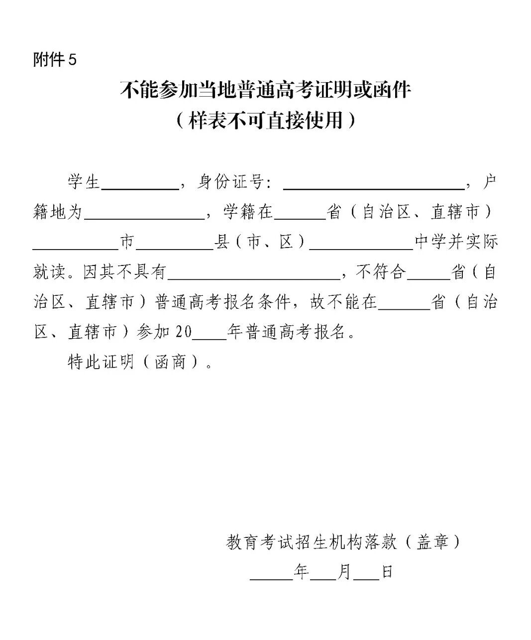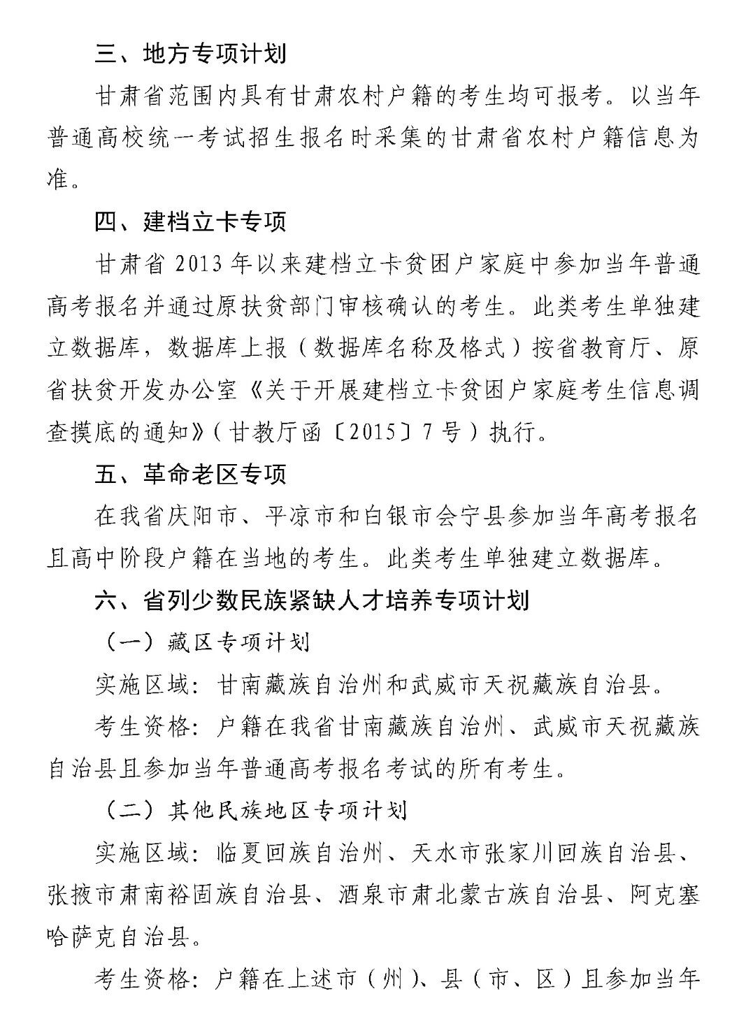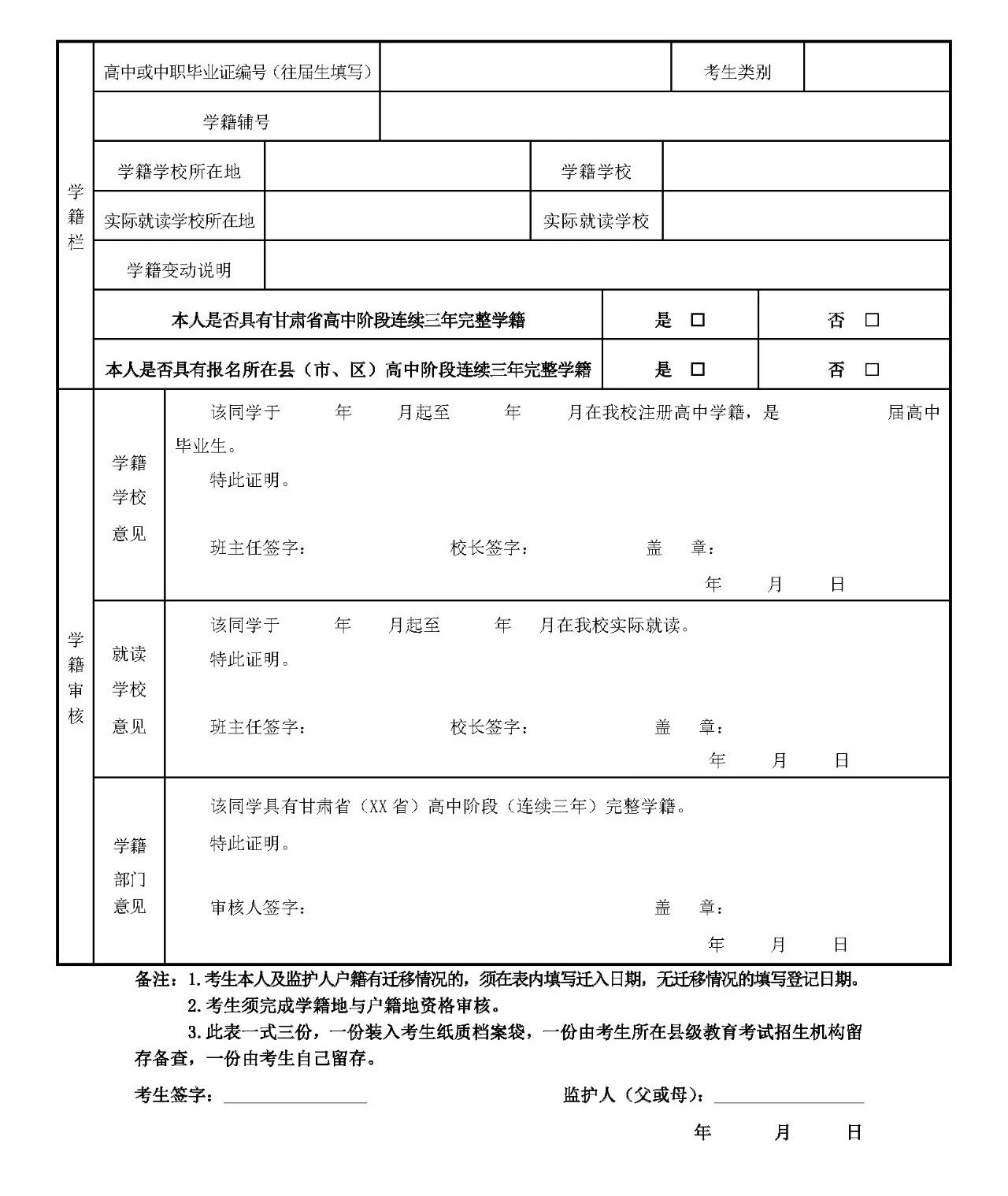 关于做好2026年甘肃省普通高校招生统一考试报名工作的通知 为稳妥做好甘肃省2026年普通高等学校招生统一考试(以下简称“普通高考”)报名工作,根据教育部及我省有关规定,现将我省2026年普通高考报名工作有关事宜通知如下: 一、报名对象 2026年参加甘肃省普通高校招生的所有考生(包括统考考生、强基计划、高水平运动队、运动训练、武术与民族传统体育专业单独招生、职教师资单独招生、残障生单独招生、保送生、拔尖人才班、消防单招及高等职业教育考试招生综合评价录取和中职升学考试等)均须在规定时间内参加报名并采集相关信息。 二、报名条件 (一)符合下列条件的人员,可以申请报名参加普通高考 1.遵守中华人民共和国宪法和法律; 2.高级中等教育学校毕业或具有同等学力; 3.身体状况符合相关要求; 4.户籍或学籍符合下列条件之一: (1)具有甘肃省户籍、高中阶段学籍的考生,出生后首次申报户口登记在甘肃(身份证号码前两位为62),无外省迁转记录,可在我省报名参加普通高考。 (2)按照教育部《2025年普通高等学校招生工作规定》“进城务工人员及其他非户籍就业人员的随迁子女接受高中阶段教育后在当地参加高考”要求,具有甘肃省户籍,出生后首次申报户口登记在甘肃(身份证号码前两位为62),无外省迁转记录,且父亲或母亲或法定监护人为我省常住户籍,在外省接受高中阶段教育的考生,在接受高中阶段教育省份报名。不符合接受高中阶段教育省份高考报名条件,不能在当地高考报名的考生,须具有外省学籍所在地教育考试招生机构出具的不能参加当地普通高考的证明或相关函件(样见附件5),并持相关人员户籍、学籍所在地教育行政部门出具的学籍、学业水平合格考考试成绩证明及综合评价信息等材料,申请在户籍所在县(市、区)报名参加普通高考。考生及父亲或母亲或法定监护人须对不能参加接受高中阶段教育省份普通高考的证明或相关函件的真实性负责,考生前往户籍所在县(市、区)教育考试招生机构进行资格审核时,签订《在甘外省份接受高中阶段教育考生参加甘肃省普通高考报名诚信承诺书》(见附件6)。 (3)外省户籍迁入我省的考生,满足下列条件之一的,可在我省报名参加普通高考。 ①考生本人在我省初中毕业、具有高中阶段连续三年完整学籍并在学籍学校实际就读的,高考报名时本人须具有我省户籍、其父亲或母亲或法定监护人具有我省户籍。 ②考生本人具有我省高中阶段连续三年完整学籍并在学籍学校实际就读的,户籍迁入我省时间须满三年(时间截止到2026年8月31日),其父亲或母亲或法定监护人具有我省户籍且满三年(时间截止到2026年8月31日)。 (4)进城务工人员随迁子女在我省参加普通高考按照《关于做好进城务工人员随迁子女接受义务教育后在我省参加升学考试工作的实施方案》(甘教厅〔2012〕216号)执行。进城(乡镇,下同)务工人员须在报考地具有合法稳定职业、合法稳定住所(含租赁)并按照国家规定参加社会保险等。 ①考生本人在我省小学毕业、具有初中连续三年完整学籍、高中阶段连续三年完整学籍并在学籍学校实际就读的,高考报名前,其父亲或母亲须在报考地具有我省合法的居住证,并在报考地缴纳养老保险或医疗保险。 ②考生本人在我省初中毕业、具有高中阶段连续三年完整学籍并在学籍学校实际就读的。其父亲或母亲须在报考地具有我省合法的居住证且居住时间满三年(时间截止到2026年8月31日),并在报考地缴纳养老保险或医疗保险满三年。 ③考生本人具有我省高中连续三年完整学籍并在学籍学校实际就读的,其父母双方须在报考地具有我省合法的居住证,且居住时间满三年(时间截止到2026年8月31日),并在报考地缴纳养老保险或医疗保险满三年。 满足上述条件之一的随迁子女考生可在学籍所在地参加高考报名,往届高中毕业随迁子女,能够继续提供父亲或母亲居住证与缴纳保险材料,上一年度在我省参加普通高考的,可继续在我省参加高考报名。不符合相关条件的考生回户籍所在省报名参加考试。 (5)在考生高中就读阶段,考生父亲或母亲军转安置或工作调动(国家机关、事业单位、驻甘部队现役军人(含文职人员)、国有企业人事管理部门办理的调动)至我省,考生同时迁转常住户籍与高中阶段学籍至我省,并在学籍学校实际就读的,出具相关证明后,可不受户籍、学籍年限限制。我省当年高考报名结束后,不再受理此类考生的报名申请。 (6)考生作为被收养人,户籍已迁入收养人名下,考生持有民政部门出具的有效证明,收养人具有我省户籍且满三年(时间截止到2026年8月31日),考生本人具有我省高中阶段连续三年完整学籍并在学籍学校实际就读。 (7)中职生报名 ①具有甘肃省户籍,出生后首次申报户口登记在甘肃(身份证号码前两位为62),无外省迁转记录,具有我省中等职业学校(含中师、职业中专(职业高中)、成人中专、技工学校,下同)学籍的应往届毕业生可报名参加中职升学考试,也可报名参加普通高考。 ②具有甘肃省户籍,出生后首次申报户口登记在甘肃(身份证号码前两位为62),无外省迁转记录,且父亲或母亲或法定监护人为我省常住户籍的非我省中等职业学校学籍的中职毕业生,不得报名参加中职升学考试,但可报名参加普通高考。 ③户籍迁入我省具有我省中职学校学籍并在学籍学校实